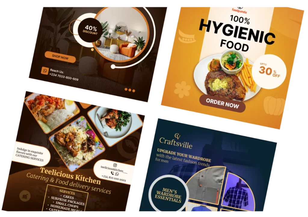 Piezas visuales creativas y funcionales para redes sociales, presentaciones y publicidad.